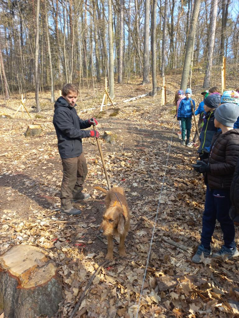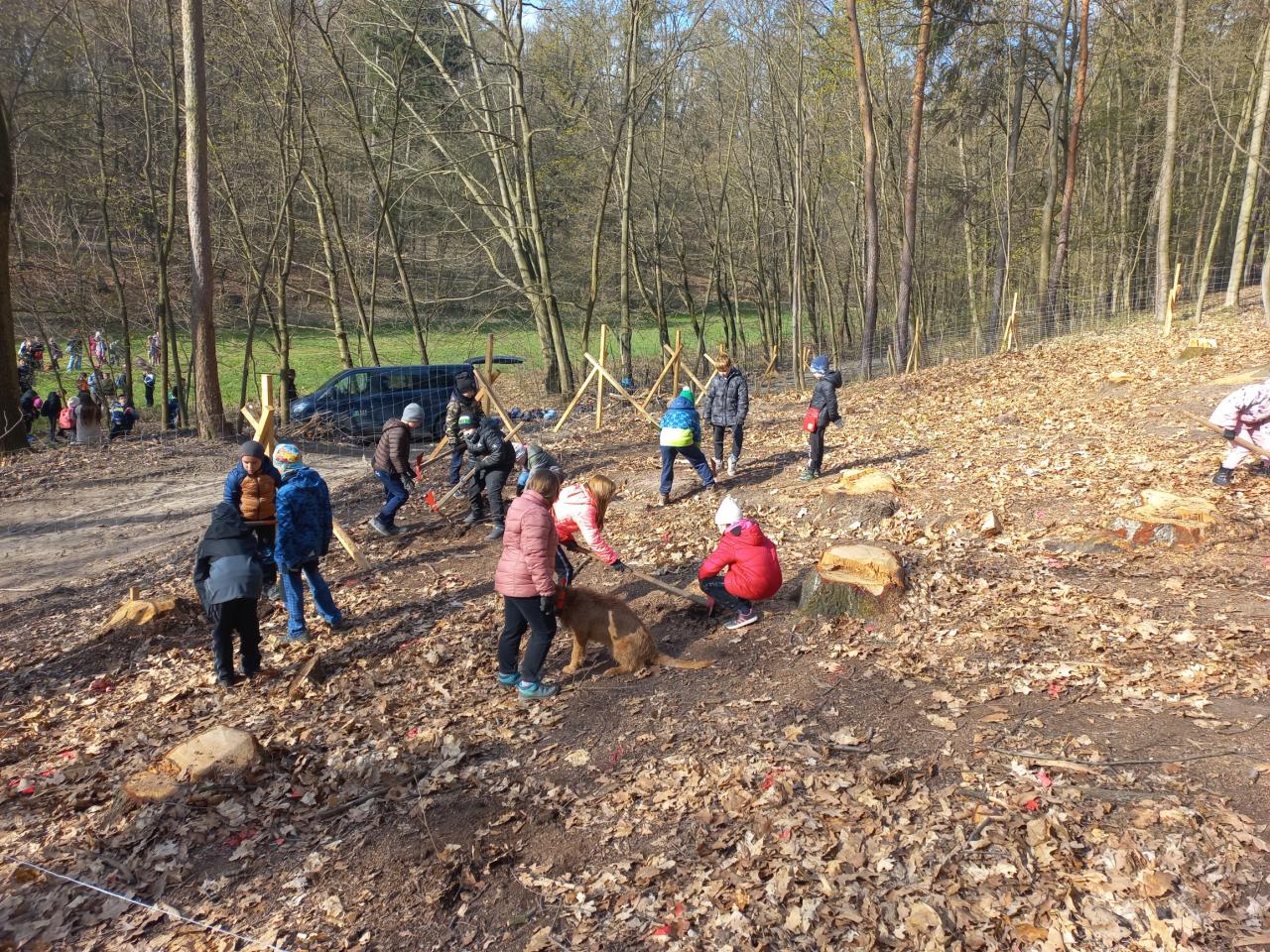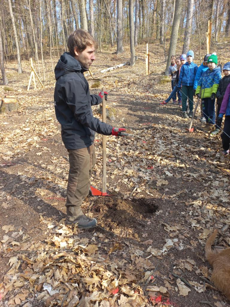 Čekal na nás zkušený lektor Marcel, nářadí, oplocenka a spousta sazeniček dubů, buků a javorů. Po krátkém úvodu - co, kde a proč sázíme (místo vykáceného invazivního dubu červeného původní dřeviny), kdy se děti také dozvěděly např. co je to terminální pupen, kořenový krček, sekeromotyka, jak se stromky správně sázejí a proč se musejí po vysazení chránit, jsme se mohli pustit do sázení.