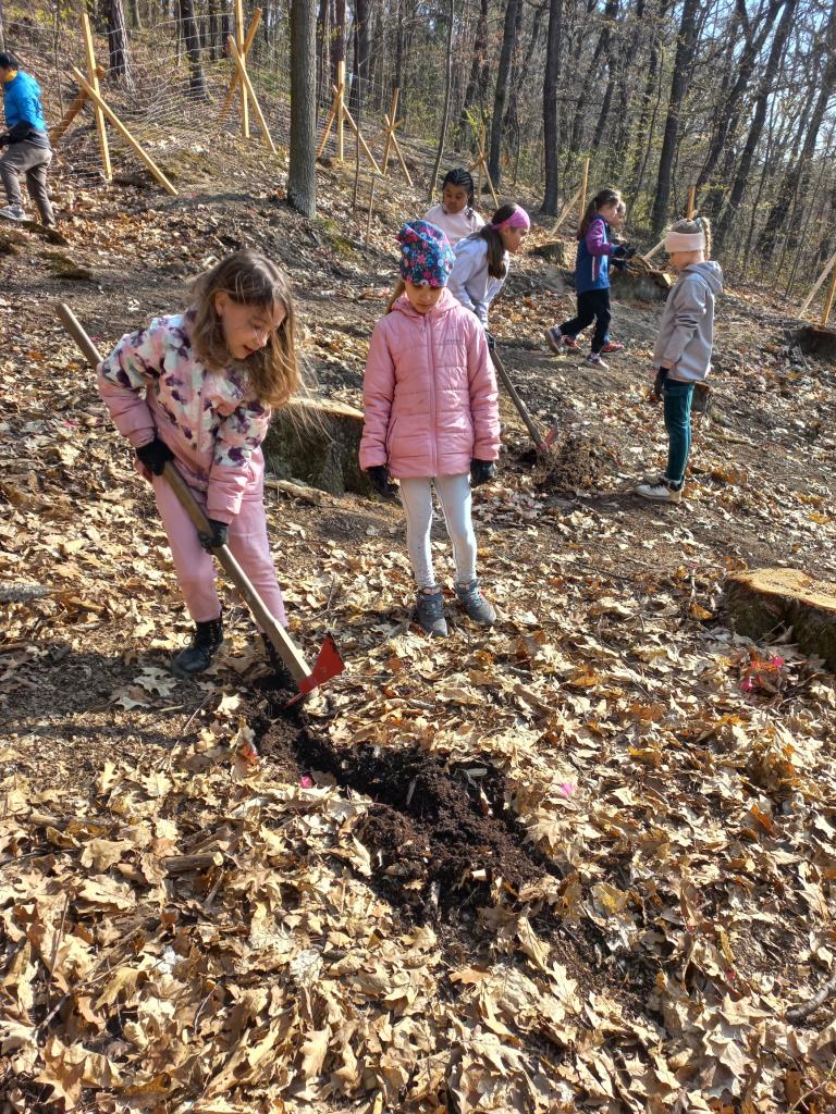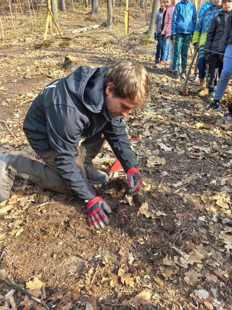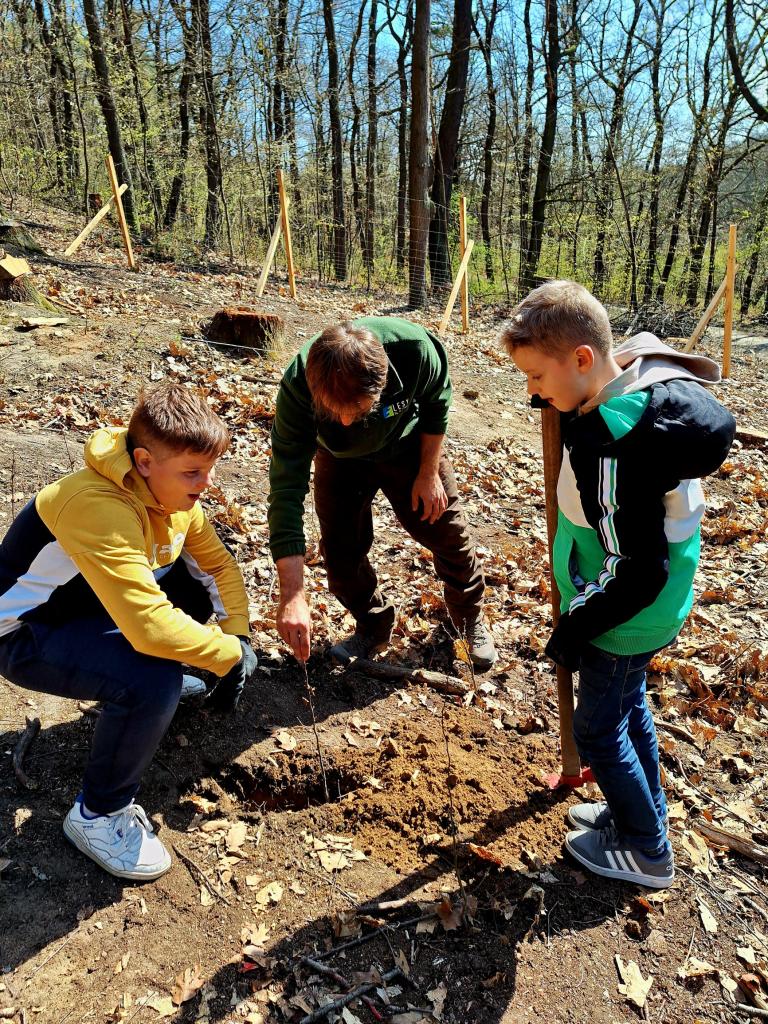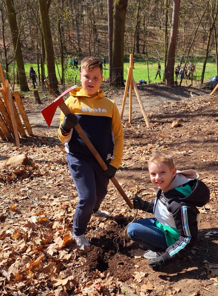 Děti spolupracovaly ve dvojicích a každý účastník si mohl pod dohledem lektora vysadit několik stromků, které na tomto místě budou růst po následujících 100 - 150 let. I když práce nebyla úplně jednoduchá, všichni nadšeně pracovali a vysloužili si lektorovu pochvalu. Po dokončení výsadby byli sázející spokojeni a příjemně unaveni.