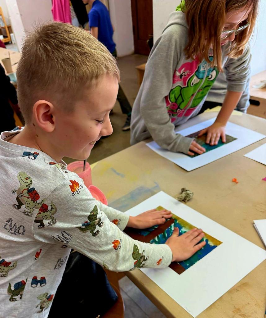 Poté, co děti vstřebaly všechny dojmy z prohlídky a výkladu (kromě jiného si prohlédly obrázky současného Jeruzaléma a Getsemanské zahrady a také si přivoněly k lahvičce s myrhou), mohly v ateliéru popustit uzdu své fantazii a vytvořit si grafickou technikou monotypu Getsemanskou zahradu v barvách, které si samy zvolily.