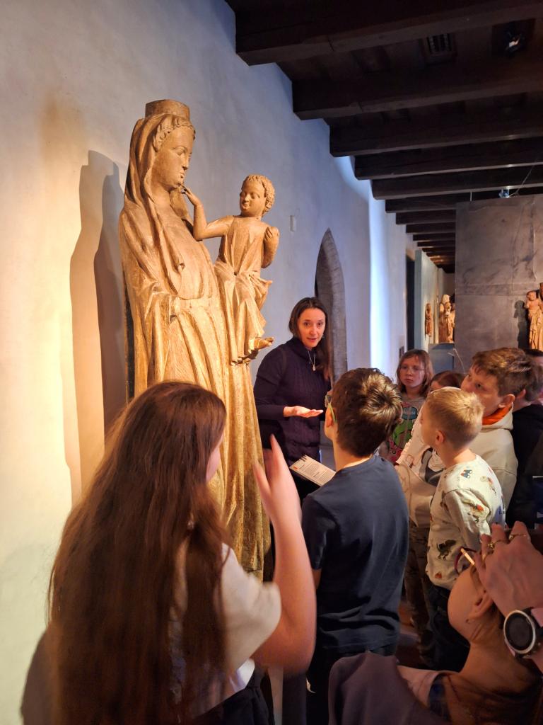 Dozvěděli jsme se, proč jsou obrazy hodně zlaté, jaká je symbolika barev a ptáčků, kteří se na obrazech vyskytují (stehlík, brkoslav, hýl...), čím se liší madona a pieta a mnoho dalšího. Vše jsme i mohli zblízka prohlédnout, takže děti se na pár centimetrů seznámily se skvostnými obrazy a sochami např. Mistra Vyšebrodského oltáře, Mistra Třeboňského oltáře, Mistra Krumlovské Madony, Mistra Rajhradského oltáře a mnohými dalšími.