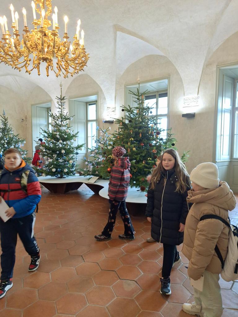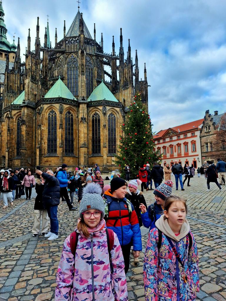 Pokračovali jsme výšlapem na Pražský hrad, kde jsme zhlédli polední vojenskou přehlídku a výměnu stráží, prošli jsme se vánočně vyzdobeným areálem Pražského hradu a v Rožmberském paláci jsme se nechali okouzlit výstavou "Křehká krása Vánoc" - nádherně nazdobenými vánočními stromky spojenými s filmovými pohádkami.... a s vánoční náladou jsme se vraceli zpátky do školy.