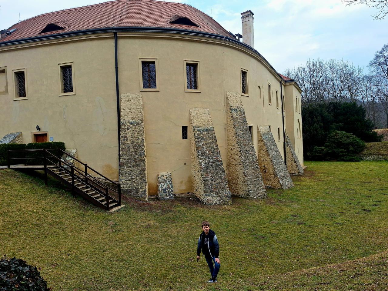 My jsme si prohlédli volně přístupné prostory - malý anglický park se pěknými dřevinami a sochami, hospodářský dvůr, nádvoří zámku s arkádami a vystaveným zvonem i příkop kolem zámku (původně středověké tvrze). Pak jsme se přesunuli k bývalé stodole, jejíž upravené prostory jsou nyní využívány Muzeem pravěku Archevita.
