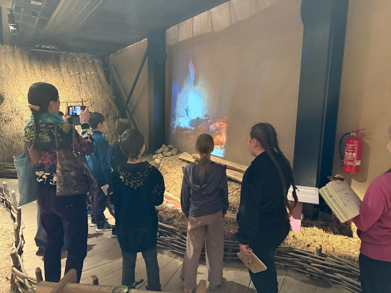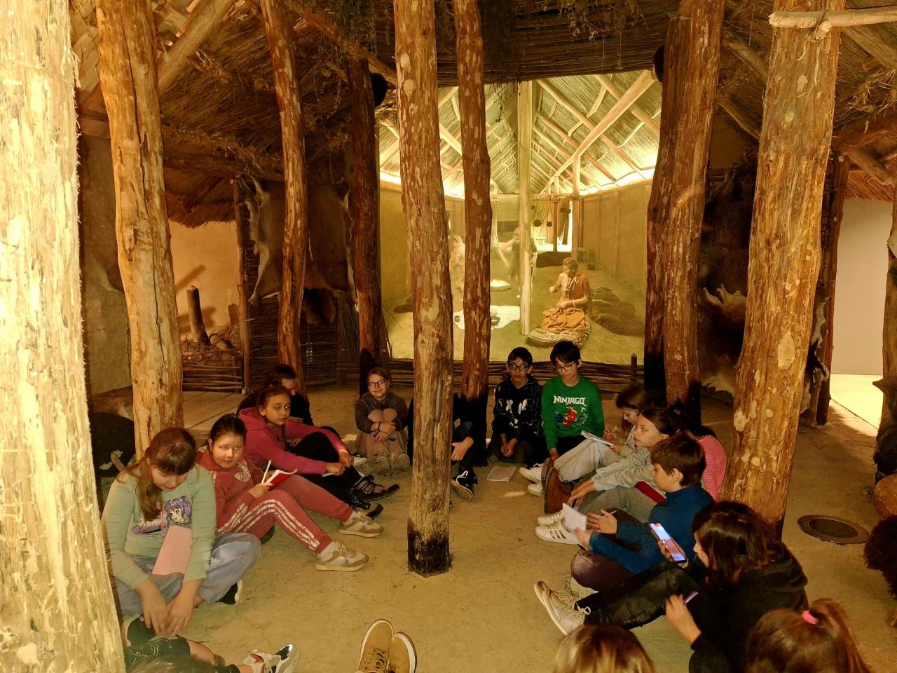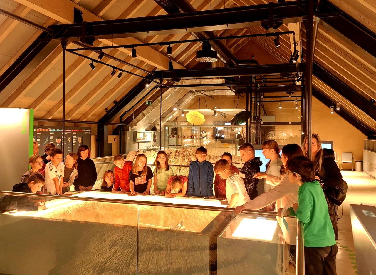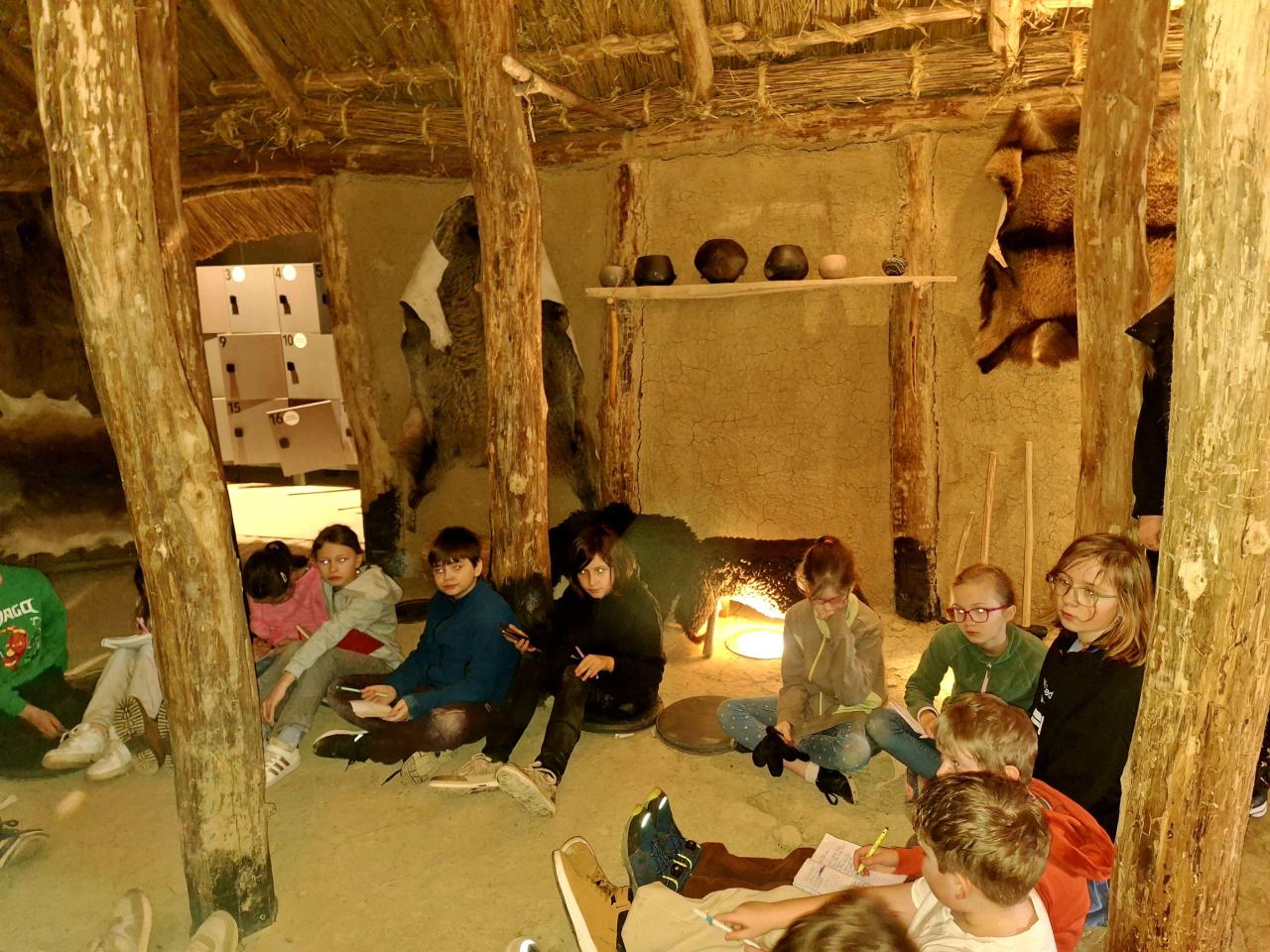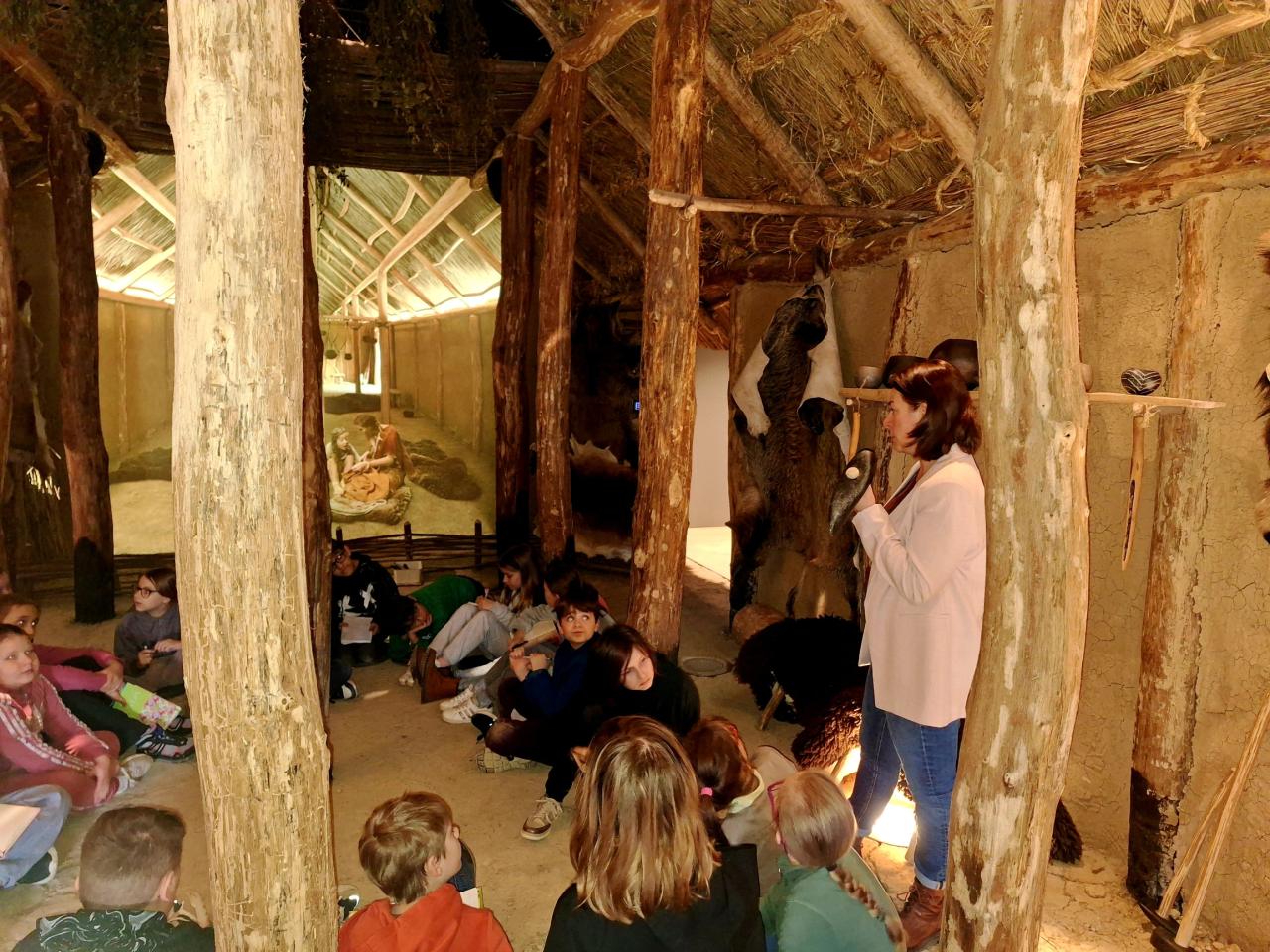 Pak nás už zcela "pohltil" pravěk. . . Lektorka děti provedla během interaktivního programu "Stopami věků - Pohleď z Archevity" pravěkým obdobím našich dějin - děti si kromě sluchových a zrakových vjemů mohly většinu exponátů osahat, vyzkoušet si k čemu sloužily i jak se žilo v pravěkých obydlích atd... dozvěděly se spoustu nových věcí a samy prozkoumaly celou expozici.