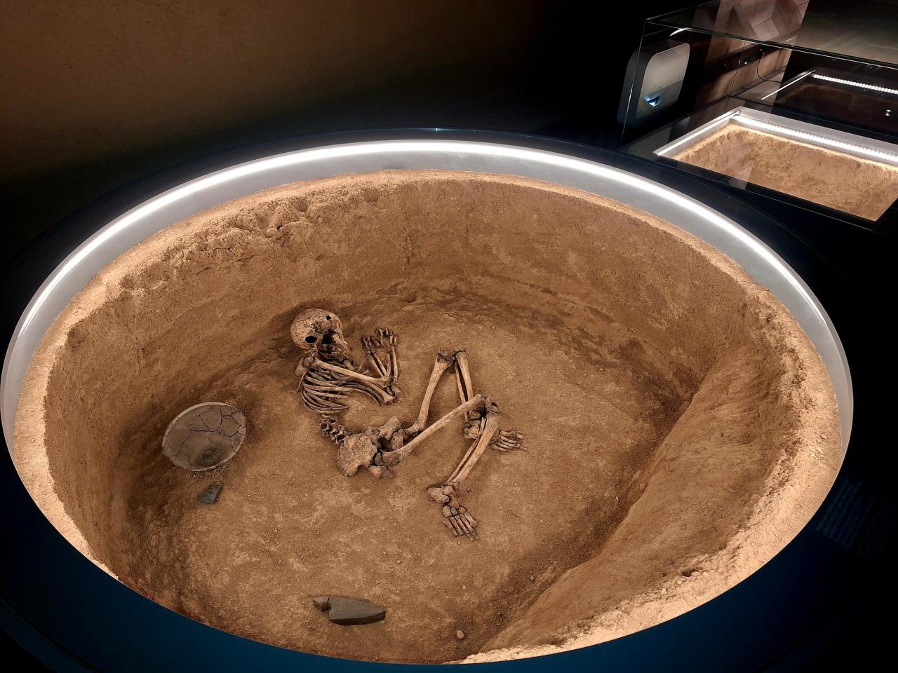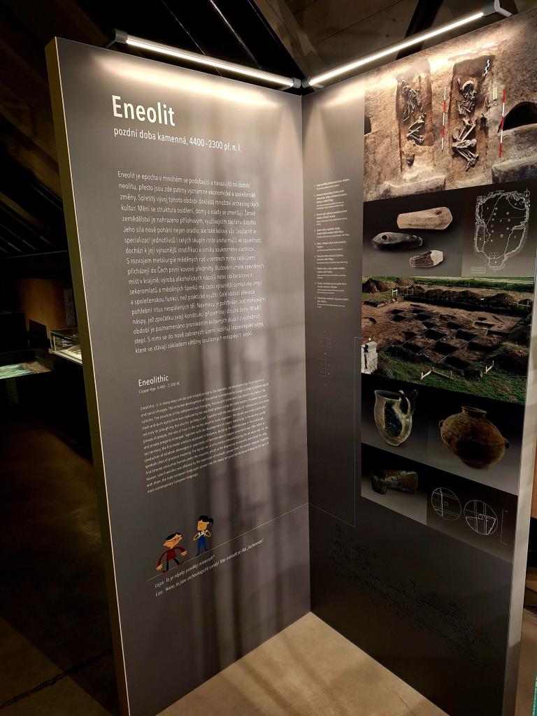 "Pro návštěvníky je připraveno mnoho zajímavého z období pravěku od původních typů obydlí v měřítku 1:1, přes archeologické nálezy až po rekonstrukce pohřebních celků. Vše je doplněno počítačovými perspektivami a holografickými projekcemi. Na ochozové galerii jsou představeny pravěké exponáty doplněné modelacemi hrobů, vč. videomappingu. Dětského návštěvníka upoutá nejen dětský koutek ale i hravé a vzdělávací prvky v podobě infokiosků s rozšířenou informační základnou. Unikátní expozice tak nabízí nezapomenutelný zážitek propojením archeologie s moderními technologiemi a kvalitním edukativním programem."