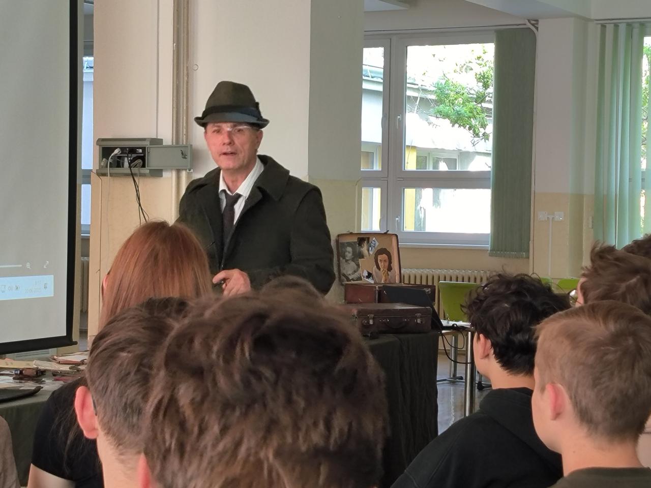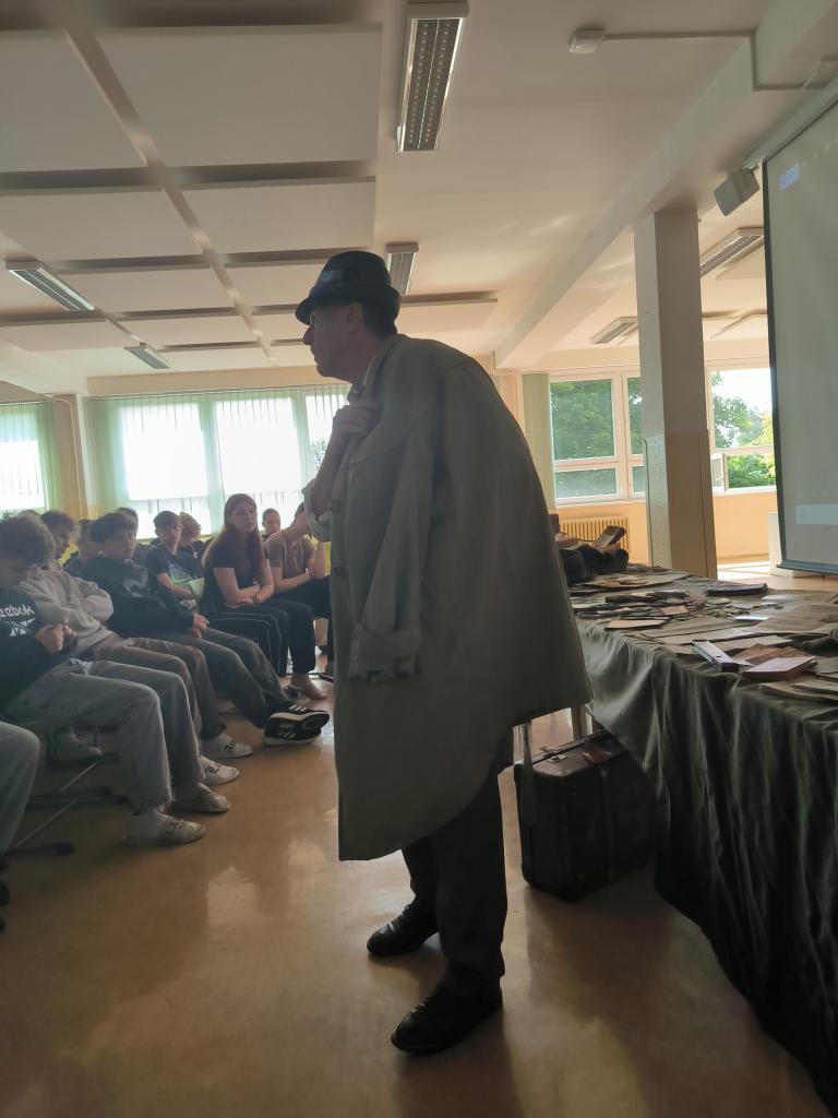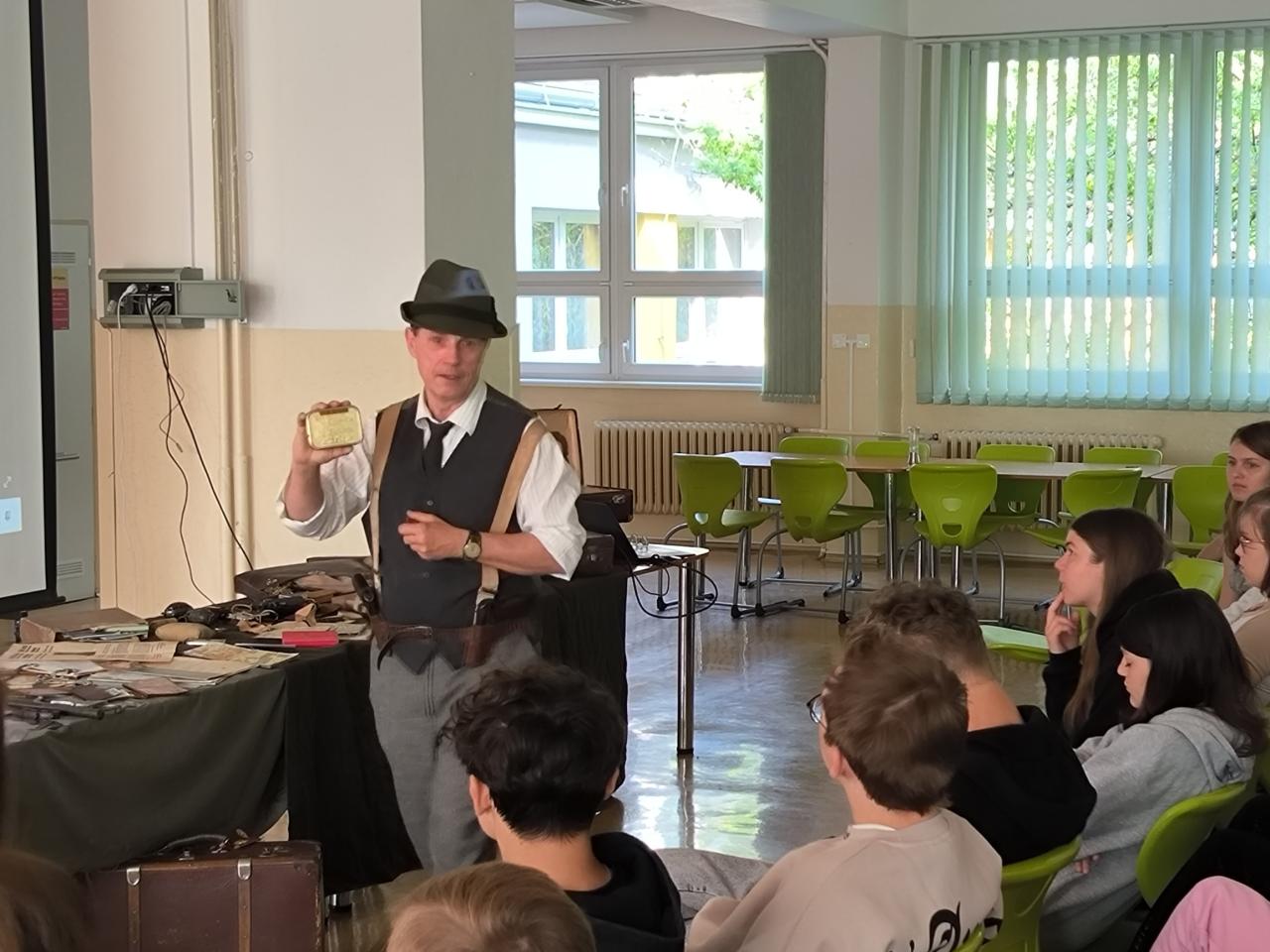 Symbolicky v den 83. výročí vyhlazení obce Lidice nacisty, jako odvetu za atentát na Heydricha jsme pozvali uznávaného odborníka na zbraně, taktiku a moderní historii plk. mgr. Pavla Černého, který nás během dvou hodin dostal, díky replikám zbraní, osobních průkazů, oblečení, radiostanic a dalších komponentů do období počátku protektorátu, kdy gestapu dělalo těžkou hlavu trio odbojářů, známé jako Tři králové a kdy se po Praze pohybovala dvojice československých vojáků s jasným úkolem. Zlikvidovat krvavého Reichsprotektora a šéfa gestapa a SD Reinharda Heydricha. Přednáška byla provázena mnoha videodokumenty a možnostmi si repliky zbraní (zvláště pak velmi vzácného samopalu sten gun) "osahat". Přesně takto si představuji přednášky pro školy! Uznávaný odborník, který umí nadchnout, pracovat s dětmi a moderní technikou a který má zároveň sebou desítky předmětů na ukázku a jemuž nevadí, když si je děti xkrát za sebou vyzkouší a potěžkají. Chápe totiž, že jen tak se studentům vryjí do paměti jména jako plk. Balabán, plk. Mašín, kpt. Morávek či rotmistři Jozef Gabčík a Jan Kubiš.