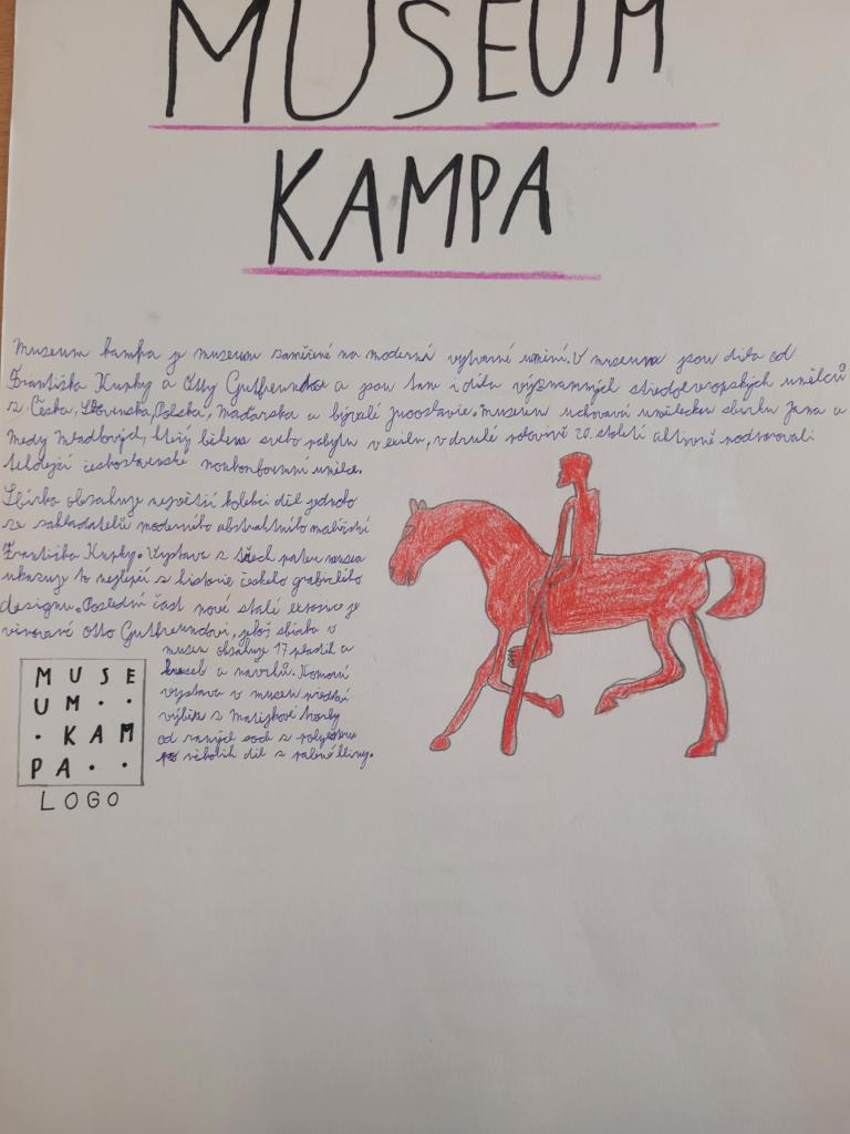 V rámci Exkurzního projektového dne se skupina pod vedením Mgr. Sázavské vypravila do Muzea Kampa, kde zhlédla s komentářem milé paní průvodkyně výstavu Identita - příběh českého grafického designu, tedy díla, ve kterých jde ruku v ruce estetická kvalita, dobré technické nebo řemeslné provedení a funkčnost: ikonické plakáty, špičkově upravené knihy a časopisy, desítky logotypů, vývoj státních symbolů, navigačních systémů a také výjimečné příklady grafického designu z epochy audiovizuálních médií. Dále pak i obrazy z trvalé expozice Františka Kupky, českého malíře, grafika a ilustrátora, jednoho ze zakladatelů moderního abstraktního malířství. Výstava se dětem moc líbila a následně jejich projekty stály za to!