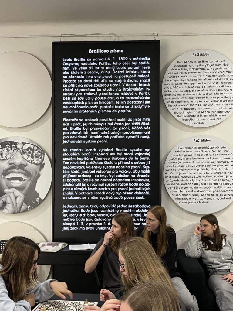 Naše exkurze se zaměřila na svět nevidomých lidí. Navštívili jsme "Neviditelnou výstavu", kde jsme si celou hodinu vyzkoušeli pohybovat se v naprosté tmě, ve speciálně zatemněných místnostech. Poznali jsme, jak se nevidomí lidé mohou cítit, jaké výhody máme my, když vidíme a jak není pro ně jednoduché orientovat se ve světě lidí, kteří vidí. Ale také jsme zjistili, že nevidomí lidé se umí bavit a jejich svět je nečekaně pestrý. Osvětlená část ukazuje celou řadu zajímavých exponátů. Seznámili jsme se s Braillovým slepeckým písmem, které bylo vynalezeno před téměř 200 lety, a postupně se rozšířilo po celém světě.